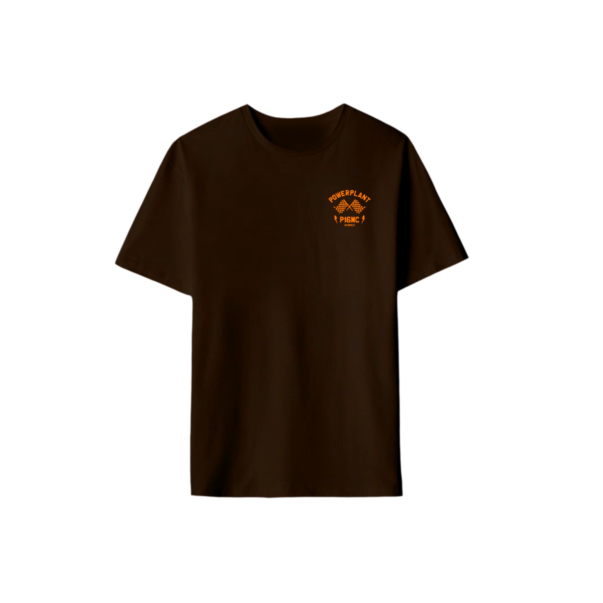 Powerplant Racing Flags Shop Classic Graphic on Brown with Orange Graphic